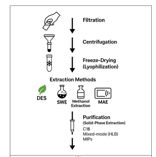 Validation of extraction efficiency remains a key step, particularly due to the complex and variable nature of environmental matrices. Recovery rates can be highly matrix-dependent, and multiple studies have emphasized the importance of sample pre- treatment steps, such as filtration and centrifugation, to improve consistency [19,20]. The presence of extracellular polymeric substances (EPS), pigments, and organic debris can interfere with both extraction and quantification [25].
