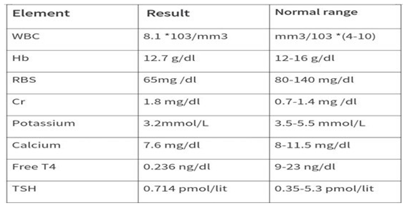 The patient was a 55 years old woman who complained of acute watery diarrhea and dehydration since 3 days ago. In the emergency department, the patient was hypotensive, with tachycardia. Signs of dehydration such as sunken eyes, delayed capillary refill time, and delayed skin turgor were observed in the general appearance. The patient was pale and there's mild pre-orbital edema. The lower extremities non-pitting edema was evident in both leg. Other examination findings were within normal limits. Primary lab test results were as the table. Then the patient was diagnosed as acute watery diarrhea follows in the due cholera complicated by AKI. Patient admitted to ICU and received adequate IV fluid and still hypotensive with no improvement and developed volume overload, then she was given dopamine with noradrenaline. Patient didn't respond to vasopressors and still hypotensive with confusion and AKI. Patient's TSH and free T4 were requested, and based in the results patient complains of hypothyroidism secondary to hypopituitarism. Finally, we prescribed her hydrocortisone 200 mg IV bolus followed by 100 mg every 8 hours and levothyroxine 0.1 mg daily. In subsequent follow-up the patient’s symptoms resolved and her life status had improve.