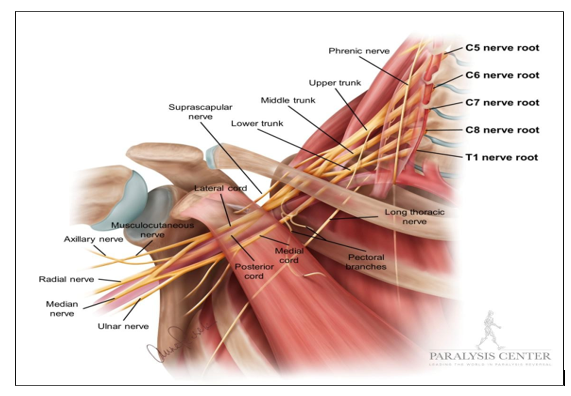 The brachial plexus is formed by the anterior (ventral) rami of the spinal nerves C5, C6, C7, C8, and T1, with occasional minor contributions from C4 or T2 [19,20].