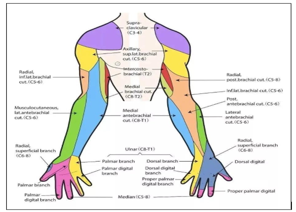 • C5 and C6: Primarily supply the shoulder and upper arm (e.g., deltoid, biceps).