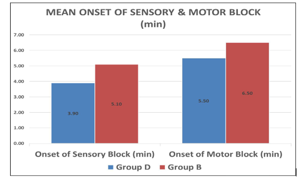 • The mean time of onset of sensory block in Group B was 5.10 ± 0.92 min. and Group D was 3.90 ± 0.84 min. (P<0.001)