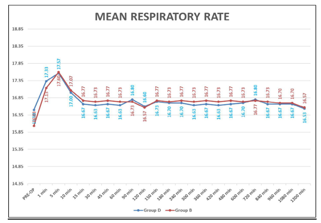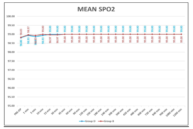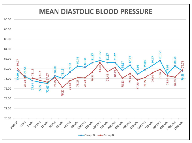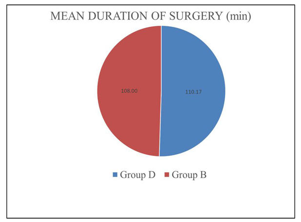 The mean duration of surgery was 108 ± 17.30 mins in Group B and 110.17 ± 20.28 mins in Group D.(P>0.05)