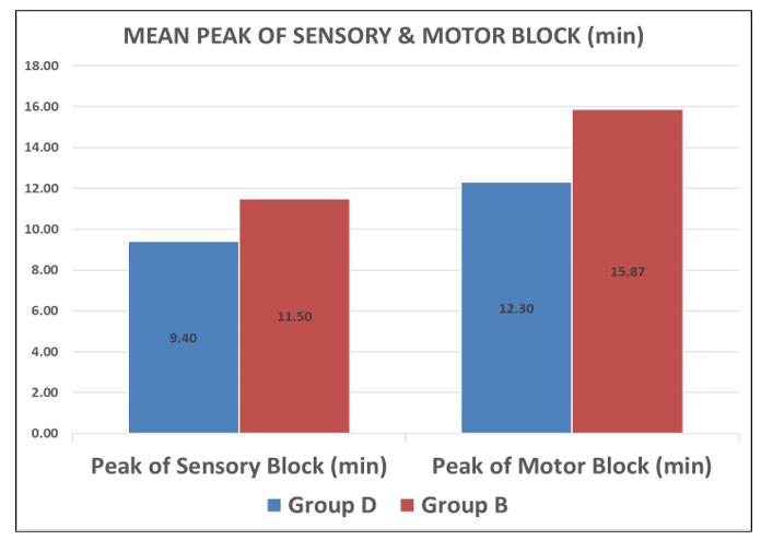In our study, the mean time to achieve peak of sensory block in Group B was 11.50 ± 0.78 min and Group D was 9.40 ± 0.93 min. The mean time to achieve peak of motor block in Group B was 15.87 ± 1.17 min and Group D was 12.30 ± 1.32 min.