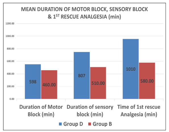 In our study, the mean time of duration of motor block, mean time of duration of sensory block and mean time for 1st rescue analgesia in Group B was 460 ± 22.89 min, 510±17.86 min & 622.66 ± 32.34 min and in Group D was 580 ± 24.91 min, 807.5±24.45 min & 1010 ± 40.66 min respectively.