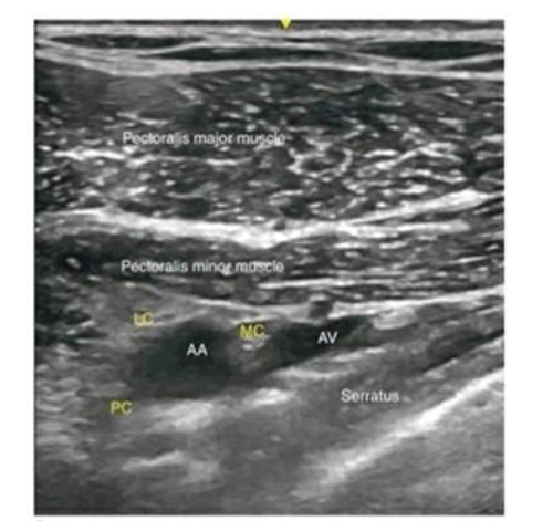 Ultrasound Image of Infraclavicular Brachial Plexus AA-Axillary Artery, AV-Axillary Vein, LC-Lateral Cord, PC-Posterior Cord, MC- Medial Cord