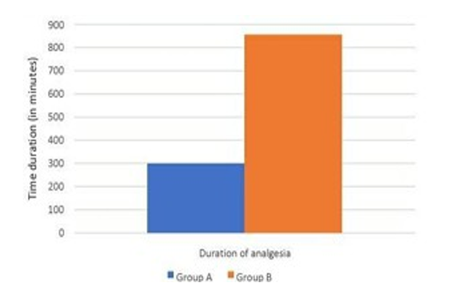 In our study, the total duration of analgesia in Group A was 299.33 ± 75.13 minutes, while in Group B it was 856.17 ± 174.71 minutes.