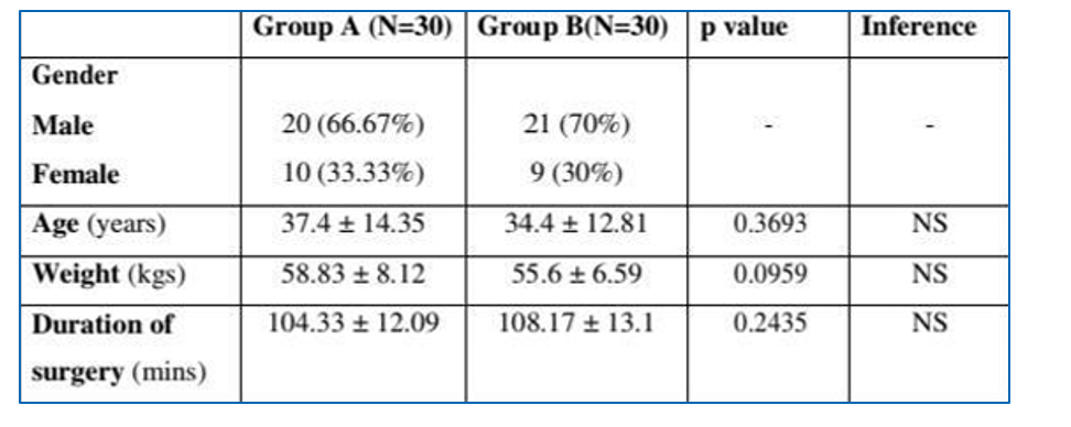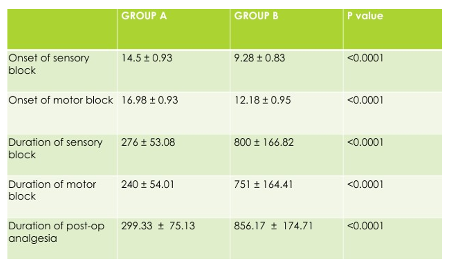 It is evident that Group B, receiving the adjuvant Dexmedetomidine, demonstrated a faster onset of sensory and motor block, longer duration of both sensory and motor block, and a prolonged duration of analgesia compared to Group A, which received only plain Bupivacaine without any adjuvant.