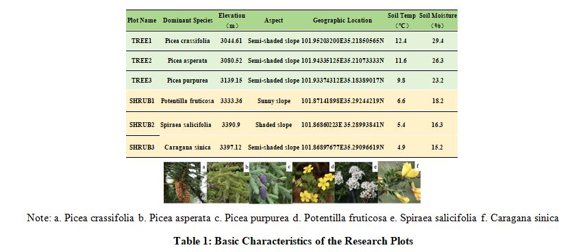 This study examines the interactions between soil microorganisms and SOC in distinct alpine tree and shrub communities within Maixiu National Forest Park. Field and laboratory methods were employed to collect and analyze environmental data (Table 1). SOC was measured using standard volumetric methods, and Illumina sequencing assessed soil microbial diversity and composition. The research explores SOC dynamics, focusing on the regulatory role of microbial communities in organic matter decomposition and carbon transformation. This work aims to elucidate micro-scale carbon dynamics in alpine ecosystems, informing predictions of carbon storage changes and supporting ecosystem management under climate change.