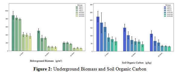 The elevated belowground biomass and SOC in tree communities suggest a more substantial contribution to carbon fixation and organic matter input, attributed to their extensive root systems [8]. Conversely, shrubs, with their shallower root systems, exhibit lower biomass and SOC, indicating reduced carbon sequestration and faster turnover rates [9]. The positive correlation between belowground biomass and SOC underscores the pivotal role of vegetation in carbon cycling, with greater biomass enhancing organic matter input and carbon sequestration potential [10].