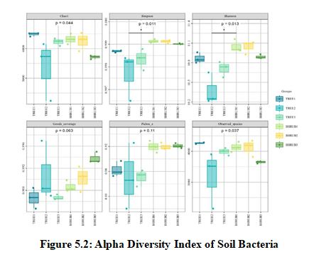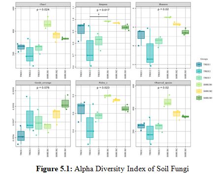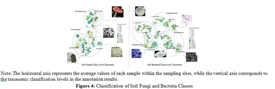 In the analysis of alpha diversity indices for soil fungi (Figure 5.1) and soil bacteria (Figure 5.2), it was observed that the shrub community (SHRUB1) demonstrated significant advantages across multiple diversity metrics. Specifically, the Chao1 index for the SHRUB1 group was 462±20 for fungi and 4613±220 for bacteria, both significantly higher than those of other communities, reflecting a higher species richness. The Simpson index was 0.98±0.01 for fungi and 0.99±0.01 for bacteria, indicating a higher species diversity within the SHRUB1 group. The Shannon index further confirmed the higher species diversity and evenness in the SHRUB1 group, with values of 6.5±0.5 for fungi and 11.0±0.5 for bacteria. These results suggest that the shrub community may provide a more favorable ecological environment for soil microorganisms, thereby promoting an increase in microbial diversity. Statistical analysis revealed that these differences were significant at the p<0.05 level, underscoring the crucial role of shrub communities in maintaining soil microbial diversity.Bacteria, with their higher diversity and uniformity, are likely central to rapid organic matter decomposition and short-term carbon release [18]. In contrast, fungi, despite lower diversity, are crucial for long-term carbon stabilization, particularly in decomposing complex organic materials [19]. Shrub soils, with their higher microbial diversity, may hasten carbon cycling, while tree soils, with richer bacterial communities and greater biomass inputs, are more significant for long-term carbon sequestration [20].