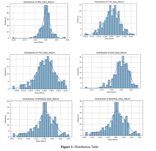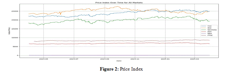 The analysis of top 100 firms across various global stock indices for FY24-25, spanning 261 trading days, reveals generally low positive average daily returns but varying volatility. The FTSE 100 exhibited the lowest volatility with lowest σ= 0.0061 suggesting stable price movements whereas, NASDAQ 100 displayed the highest volatility σ = 0.0125 alongside µ = 0.003, indicating significant daily price swings, typical of growth-oriented stocks. Euronext NV 100 offered the highest µ= 0.0017 but also high σ = 0.0113, signifying a dynamic market with higher risk-reward but S&P ASX 100 notably showed µ = 0, implying flat average daily performance with σ = 0.0073. S&P BSE 100 µ = 0.0003 and σ= 0.0092 and S&P TSX 100 with σ = 0.0005 and µ = 0.007 presented moderate returns and volatility. Overall, the period was characterized by marginal average gains, with notable differences in daily price stability across markets.
