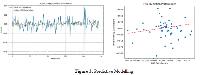 The provided visualizations offer insights into the predictive performance of different models for BSE Daily Return. The "Actual vs Predicted BSE Daily Return" time series plot, likely representing one of the regression models given its flat prediction line, demonstrates a significant inability to capture the actual daily fluctuations, showing a largely static predicted value against highly volatile actual returns. In contrast, the "DNN Prediction Performance" scatter plot, showing BSE Daily Return versus Predicted BSE Daily Return, indicates the DNN model to align predictions with actual values along the ðÂÃÃÃÂ???ÂÃÃÂ??ÂÃÂ?ÂÂ?¦ = ðÂÃÃÃÂ???ÂÃÃÂ??ÂÃÂ?ÂÂ?Â¥ line. While there's a wider scatter indicating prediction errors, the DNN appears to capture a range of movements (both positive and negative), suggesting it may offer a more nuanced, albeit still imperfect, relationship compared to the very static predictions of the regression model shown in the time series plot. Both visualizations collectively highlight the inherent difficulty in accurately predicting shortterm market movements.