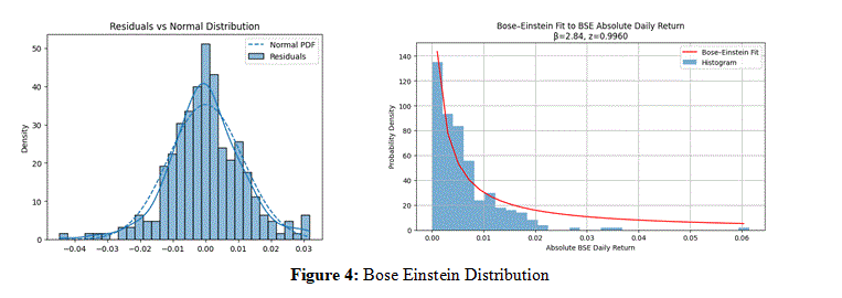 This research also underscores the inherent complexities associated with accurately forecasting short-term market movements. Bose- Einstein statistical model while offering analytical insights into stock market behaviour and pattern identification, demonstrated limitations in their predictive capacities within the scope of this study. Efficiency of the regression model was constrained by issues of residual normality and predictive precision, whereas the BoseEinstein framework, despite its descriptive utility for return distributions, exhibited restricted explanatory variance. These findings collectively highlight the formidable challenges confronting financial predictive modelling in dynamic market environments [6,7].