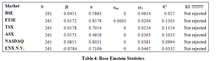The application of regression to ascertain the relationship between daily return of top 100 firms within international indices demonstrated limited explanatory power. Bose-Einstein statistics were employed to model stock market indices, conceptualizing market states as energy levels and trading events as bosons. This framework effectively captured clustering effects in trading or price movements. However, despite providing a plausible descriptive fit for observed market volatility distributions, its explanatory power was limited, as reflected in notably low Rsquared values across all markets.