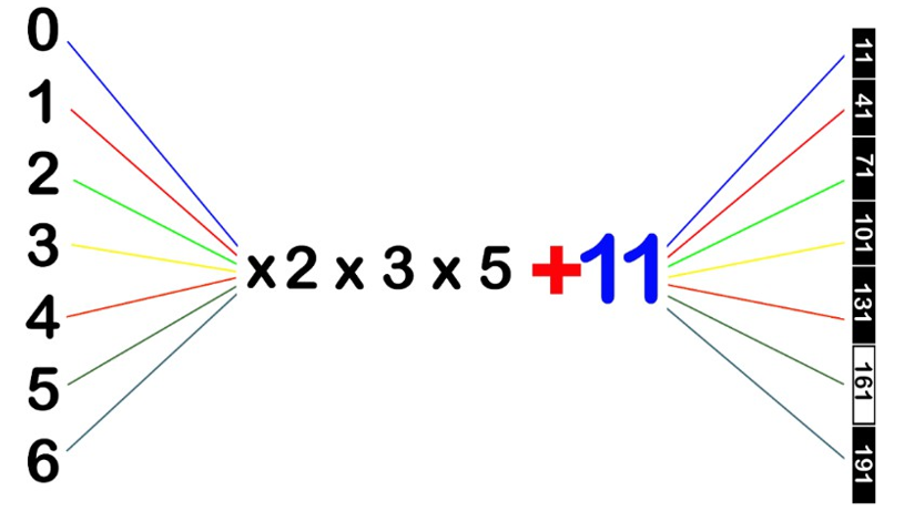 Figure 1: According to Dirichlet’s Theorem, the lack of a common factor > 1 shared between numbers on both sides of “+” implies potential primality for the sums on the right and a common difference of 30 between adjacent prime numbers on the right, with one exception of 187