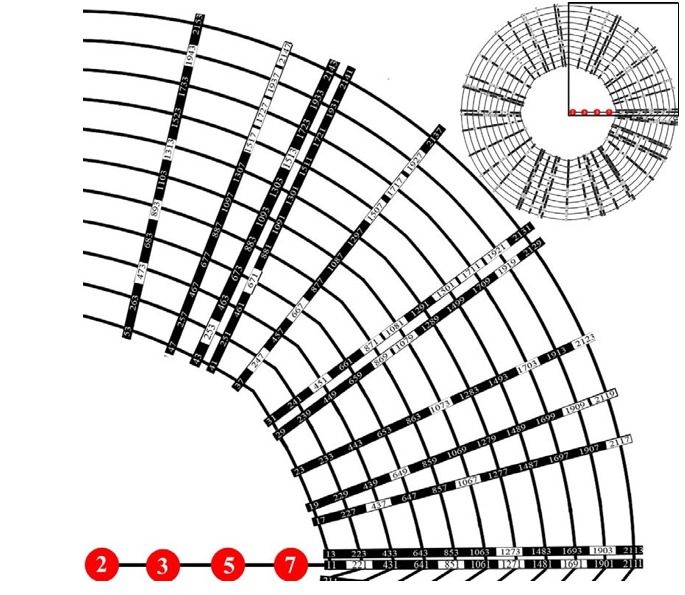 The above cases of 7 and 11, shown in Figure 1 and 2 respectively, are not exceptional. Indeed, through similar operations shown in Figure 1 and 2, more arrays of seven prime numbers may be derived from greater prime numbers (i.e., 13, 17, 19, 23, 29, and 31), and these 7-element arithmetic progressions have a common difference of 30 and cover all prime numbers (and also rare composite numbers) in the scope [7, 211]. Arranging these arithmetic progressions orderly on radii of a circle, the regular distribution of prime numbers in [7, 211] (roughly the scope of X5) is demonstrated in Figure 3.