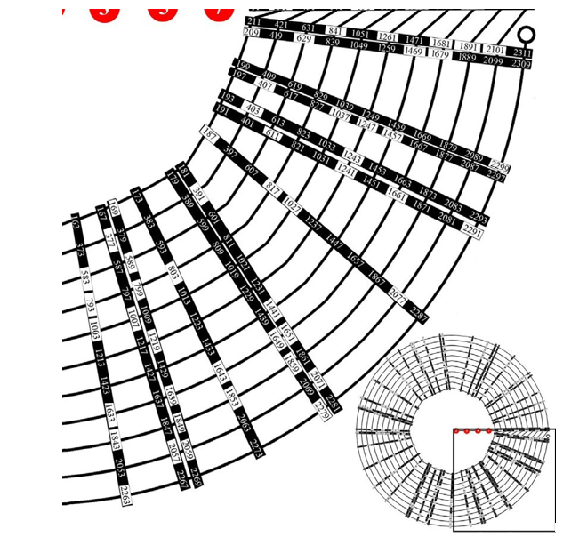 Figure 4b: After similar operation as in Figure 1-3, each prime number in [59, 103] can generate its own 11-element arithmetic progressions of prime numbers (with composite exceptions) with a common difference of 210 (= 2 x 3 x 5 x 7 = X5). Note that all numbers on the innermost circle are from Figure 3. Upper-left inset shows the position of the main figure in the whole figure. Modified from Wang 14].