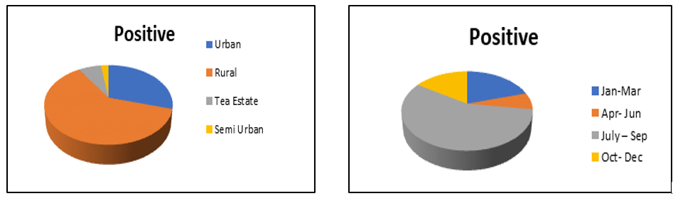 Also, the highest prevalence of seropositive cases was found in the rural areas of the 4 districts, at 63.63%. While the highest cases came during the July-September period at 56.81%, which is also the period when Assam receives heavy rainfall. resulting in the increase of the vector density. Again, it may be indicated to the presence of large number of paddy cultivation and swampy lands in the rural areas which acts as a breeding ground for the mosquitoes during the rainy season resulting in the increase of the mosquitoe population [3].