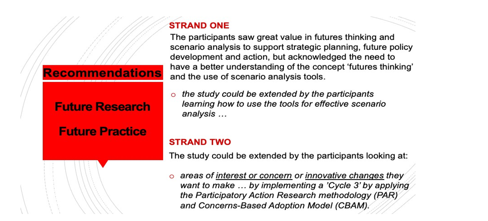 Theme: 3 Value seen in futures thinking and using scenario analysis tools for ways of addressing and helping to shape the future of education, and providing suggestions for policy development and system change.