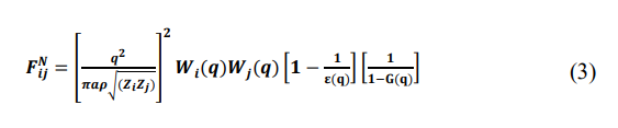 Wi(q), in Equation (11), denotes the unscreened form factor of the ith component obtained from the Fourier transform of Wi(r) (see Eq. (9)), ε(q) and G(q) are dielectric function and the local field factor in momentum space, respectively, with q as the amount of momentum transferred. These functions are taken from Ichmaru and Utsumi because their theory satisfies both the compressibility sum rule and the short-range correlation condition [19].