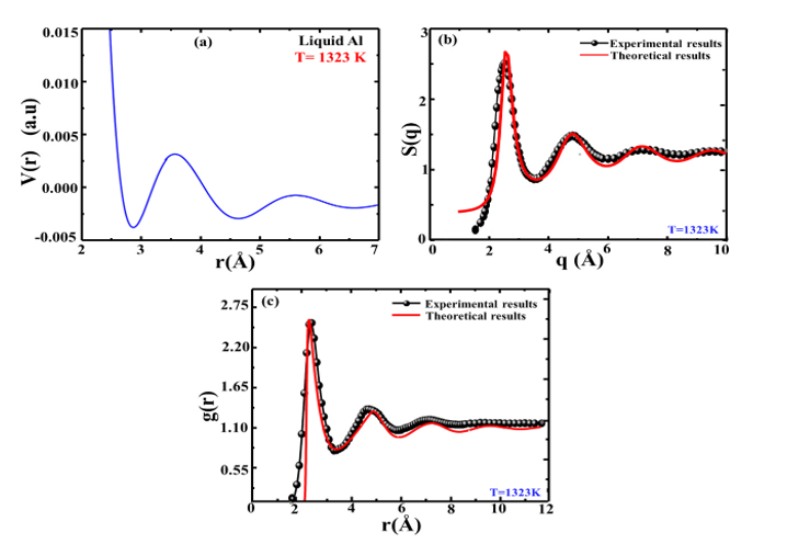 Figure 1: (a) BS Potential Profile, (b) Static Structure Factor, (c) Pair Correlation Function For Liquid Al at T=1323 K. Solid line, and Circle with Black Line Represents the Theoretical and, Experimental Results Respectively.