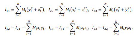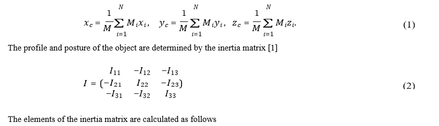 The position state of an object is characterized by the position vector of the barycenter. Considering the object as a point mass system, the position vector of a particle in the Cartesian coordinate system is ri = (xi , yi , zi), and the position vector of the object's barycenter, rc = (xc , yc , zc), can be expressed as follows
