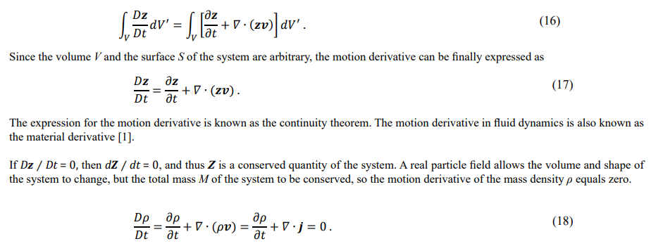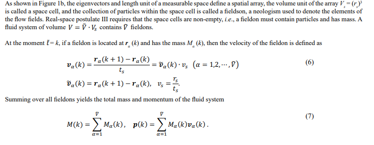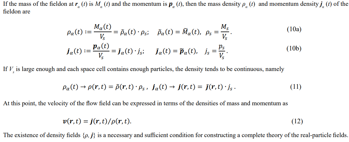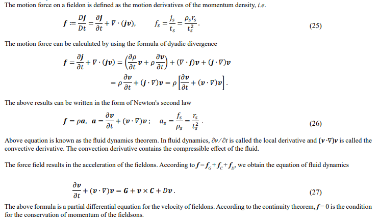 The fluid dynamics equation (27) covers the Navier-Stokes equation and Newton's laws of motion. It is the velocity equation with re- spect to the fieldon and can also be viewed as the equation of motion for a single real particle, which degenerates into Newton's laws of motion for particles under the zero-volume approximation.