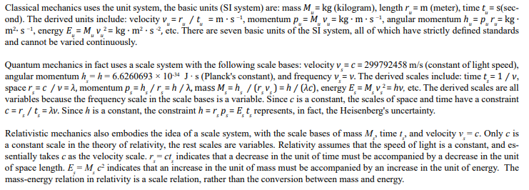 The use of variable scales as physical units can be understood as a way to study low-dimensional physics in a high-dimensional mathe- matical space. In a real particle system, if there are P well-defined physical quantities, then the dimension of its mathematical parameter space is 2P. Constrained by physical relations, the number of independent scales (scale bases) is only three, and all other scales (derived scales) can be derived from the scale bases. The scale system, or unit system, is an important symbol that distinguishes modern physics from classical physics.