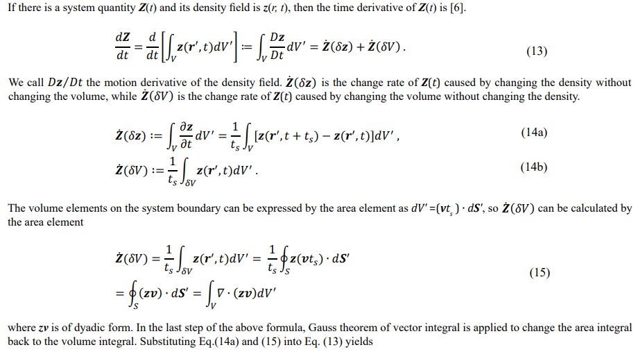 A fluid system is defined as a subset of the measurable space. As shown in Figure 1b, let S be an arbitrary closed surface within the measurable space. All particles contained in S are called the fluid system, and the space outside S but inside Sm is called the fluid sur- roundings. The system and its surroundings can transfer momentum and energy across the interface.