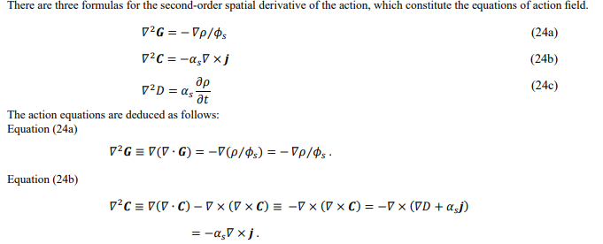 The significance of the action field can be identified from the scale: the gradient represents acceleration, while the divergence and curl indicate vibrational and rotational frequencies, respectively. Both gradient and curl are inversely proportional to the square of the dis- tance, and divergence is proportional to the change rate of the mass potential. The gradient formula is in the same form as Newton's law of gravitation and Coulomb's law of electrostatics, the curl formula is in the same form as the Biot-Savart's law for static magnetic fields, and the divergence formula is similar in form to the Lorenz gauge of electromagnetic fields. The D0 in the divergence formula is the boundary integration constant, which is a constraint on the exchange of energy between the system and the surroundings.