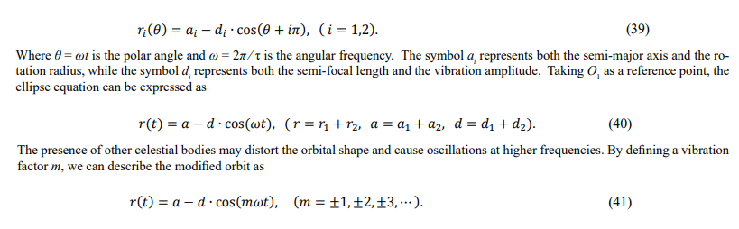 Consider a cluster consisting of two stars with masses M1 and M2 (M1 > M2 ), identified as O1 and O2, respectively. Both stars revolve around their shared center of mass Oc with the same period (τ). In the barycenter frame of reference, the two stars have well-defined elliptical orbits expressed by polar coordinates (r, θ) as [18,19].