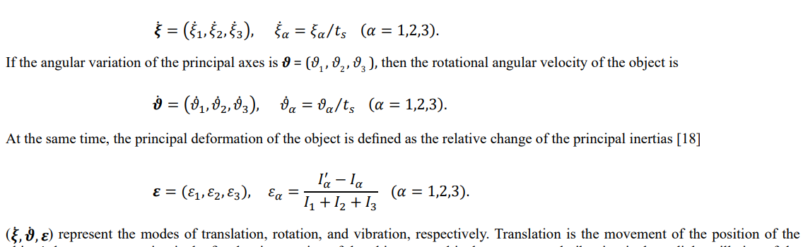 matrix (inertia principal axes). Using the barycenter as a reference, the object's motion consists of three modes: translational, vibrational, and rotational, which correspond to the temporal changes in the object's position, profile, and posture, respectively [10,15].
