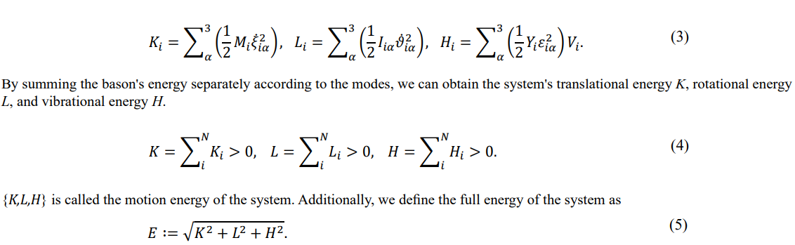 Consider a real particle system with a volume of V containing N basons. Labeling the bason's mass Mi, the principal inertia Iiα, the compression modulus Yi , and the volume Vi , we can express the bason's translation energy Ki , rotation energy Li , and vibration energy Hi as