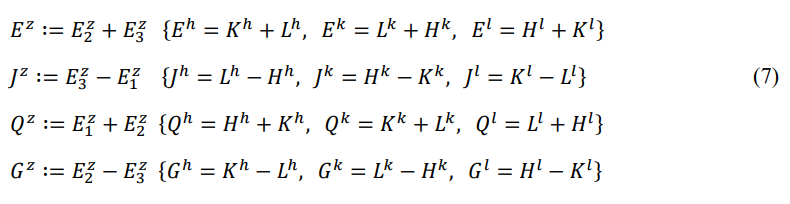 Define the derived energy according to cyclic symmetry: entire energy Ez (front-energy plus back-energy), potential energy Jz (back- energy minus main-energy), thermal energy Qz (main-energy plus front-energy), and chemical energy Gz (front-energy minus back- energy).