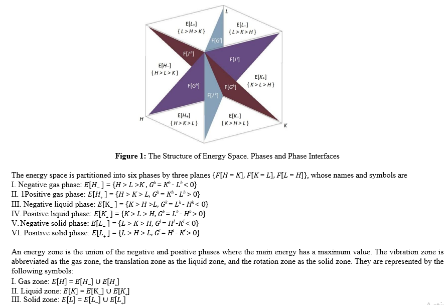 The structure of energy space can be represented by a Cartesian coordinate system containing {H, K, L} axes. For easy of illustration, we use the set symbol E[*] to denote the three-dimensional space, F[*] denote the two-dimensional planes, S[*] denote the two-dimensional curved surfaces, L[*] denote the one-dimensional lines, P[*] denote the zero-dimensional points, and the symbol “*” denote the condition or sign of the set. As shown in Figure 1, the three coordinate axes of the energy space are {H, K, L} and the three coordinate planes are {F [H = 0], F [K = 0], F[L = 0]}. The energy space is confined to the first octant (+,+,+) since the motion energy is always positive.