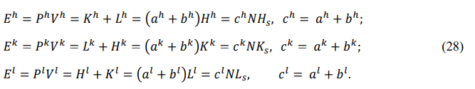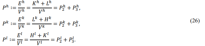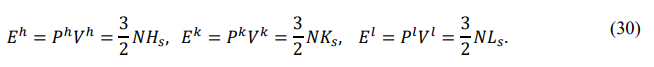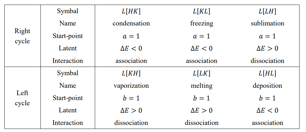 The front and back energies defined in the order of “HKLHKL” are called the right cycle, and the front and back energies defined in the order of “HLKHLK” are called the left cycle. This article uses the right cycle, while the previous papers of the author used the left cycle [15]. In both cycles, the entire energy is equal, the potential energy is always negative, the thermal energy is always positive, and the chemical energy is equal in value and opposite in sign. The calculation method for the two cycles is the same, the distinction is that the front and back energies represent different modes of motion.
