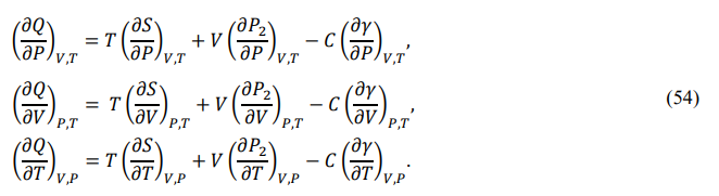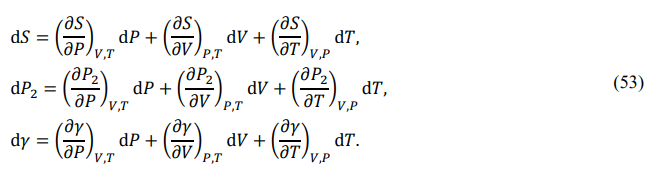 If {P,V,T} are used as independent parameters, the full differentials of {S,P2,γ} are given by