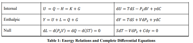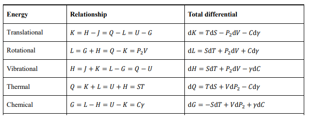 From the basic differential, other total differentials of energies can be obtained by Legendre transformations. For example, substituting SdT = dQ - TdS into the basic differential yields the differential equation for enthalpy dY = TdS + VdP2+ γdC. Table 1 lists the various energy relations and full differentials for the translation zone, which are equivalent to each other.