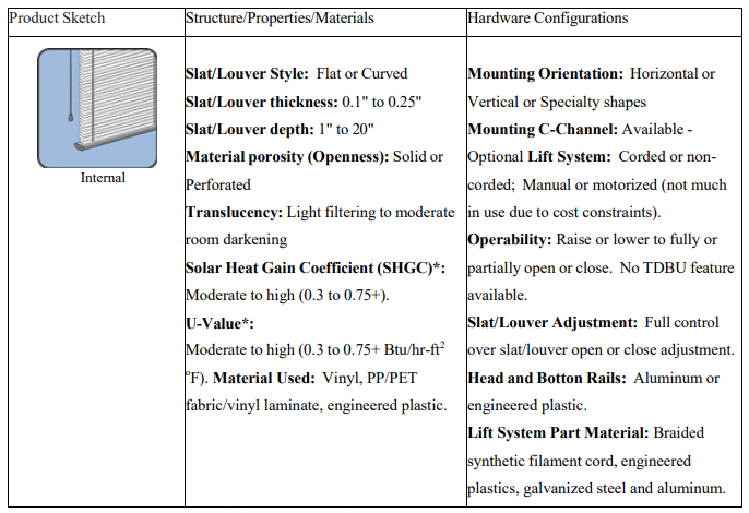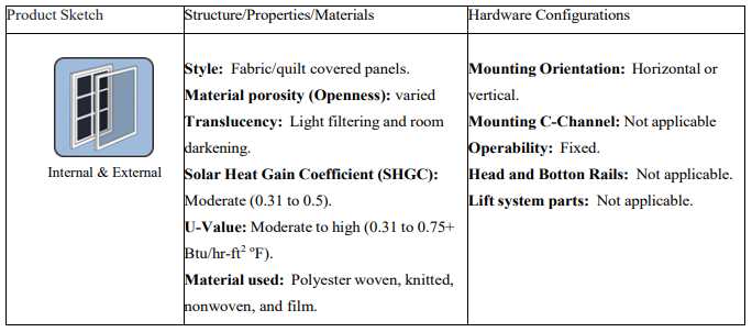 Flat Panel: Interior panel-type window shades are solid or fabric-covered panels designed to provide privacy, light control, and a clean, structured look within a room. Typically mounted on tracks or hinges, these panels slide or fold to open and close, making them ideal for covering large windows, patio doors, or room dividers. Available in a range of materials, including wood, fabric, and composite, they can be customized to complement various interior styles. Interior panel shades offer a modern alternative to traditional drapes, combining functionality with a sleek, minimalist aesthetic. Table 13 lists the attributes of flat- panel products.