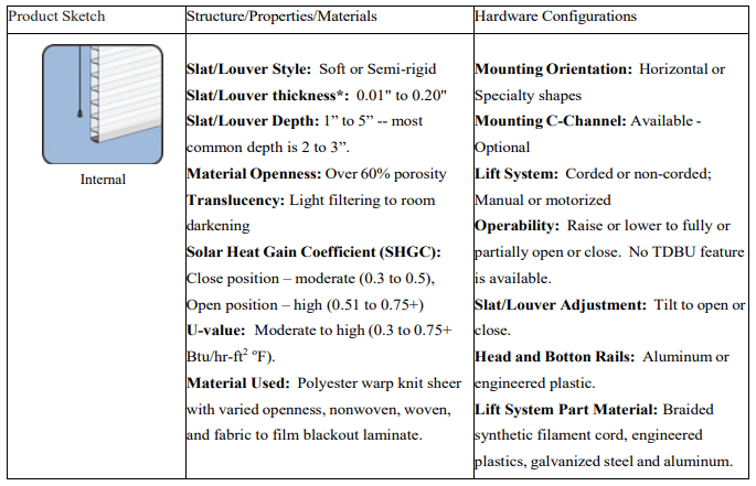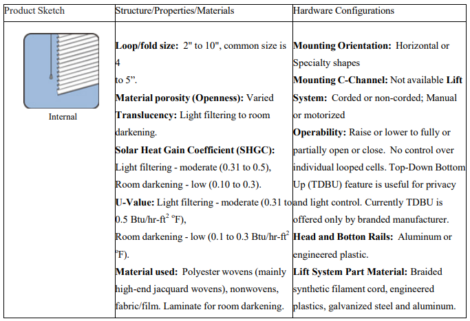 Cellular Shade: Cellular window fashions, also known as honeycomb shades, are a popular window fashion that combines style and energy efficiency [1]. Their unique structure features air pockets, or “cells,” that trap static (motionless) air to create insulation, helping to maintain indoor temperatures and reduce energy costs. Available in a variety of colors, fabrics, and opacities, cellular shades offer excellent light control and privacy while adding a sleek, modern look to any room. Cellular construction can be single- cell, multiple-cell, or cell-in-cell. They are a versatile option for homeowners seeking comfort, functionality, and aesthetic appeal. Non-branded cellular shades are very cost- effective. Table 1 lists the attributes of the cellular products.
