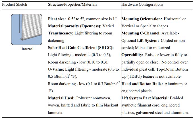 Table 1: Cellular Shade Product Attributes