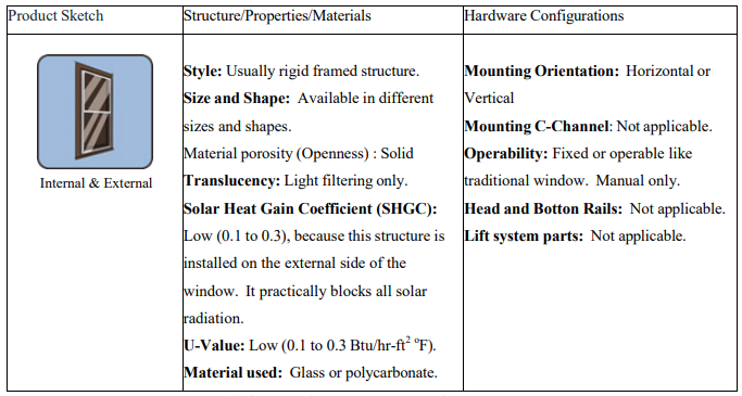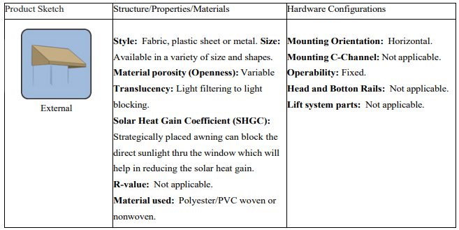 Fixed Awning: Fixed awning window shades are permanent, exterior-mounted coverings designed to provide shade and protection for windows. Made from durable materials such as metal, fabric, or polycarbonate, these awnings are angled to block direct sunlight, reducing indoor heat and glare while allowing natural ambient light to filter through. In addition to improving energy efficiency, fixed awnings enhance a building's exterior appearance and protect windows from rain and UV damage. Ideal for both residential and commercial settings, they provide a long- lasting, low-maintenance solution for controlling sunlight and weather. Table 7 lists the attributes of the fixed awning products.