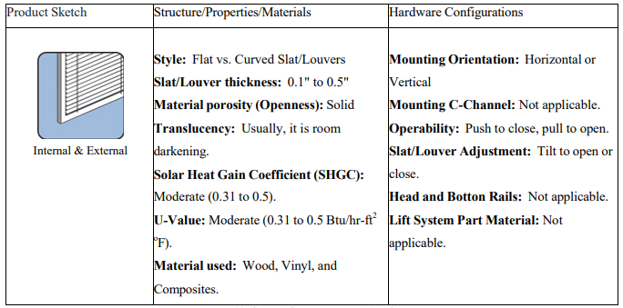 Slat or Louver Shade: Slat or louver-type window fashions, commonly called Venetian or horizontal blinds, feature adjustable slats that can be tilted to control light and privacy. Made from materials such as wood, aluminum, fabric, or vinyl, these offer a clean, structured look and are highly versatile for a range of room styles. Their design allows for precise light filtering, making them ideal for spaces where both visibility and shade are essential. Durable and easy to maintain, slat shades are a practical and stylish choice for modern window coverings. This attachment is very cost-effective and widely used in residential and commercial spaces. Table 2 lists the attributes of the slat or louver products.