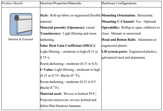 Roller Shade: Roller-type window shades are a modern, straightforward window treatment consisting of a single sheet of fabric that rolls up into a tube when raised. Known for their clean lines and minimalistic design, roller shades are available in a wide range of materials, from sheer to blackout fabrics, offering semi-flexible options for light control and privacy. Easy to operate and maintain, they are ideal for both residential and commercial spaces. With customizable colors and patterns, roller shades offer a sleek, functional solution that complements both contemporary and traditional interiors. Table 12 lists the attributes of the roller shade products.