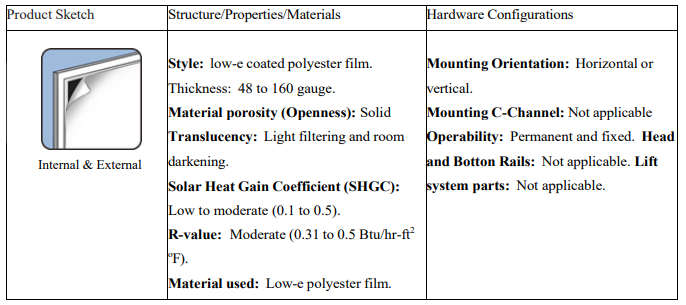Energy-efficient window films can be used either internally or externally, depending on the specific type of film and the desired outcome. Exterior films are often preferred for their superior ability to reject solar heat, as they block sunlight before it enters the dwelling through the window glass. Interior films are also common, particularly for decorative or privacy purposes, and can also contribute to energy efficiency during the wintertime. Table 14 lists the attributes of applied film products.