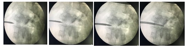 Transforminodiscal Approach- The superior concave surface of the vertebra is the entry point of the needle. The superomedial part of the vertebra is not accessible by this approach. Direct Lateral Approach [Figure 2]- for lumbar spine. Patient is placed in later- al position. Level confirmed under c-arm, local anaesthesia given and needle placed retroperitoneal and trans-psoas. Since the biop- sy trocar and needle are thin peritoneal breach doesn’t occur and Lumbar plexus is not damaged.