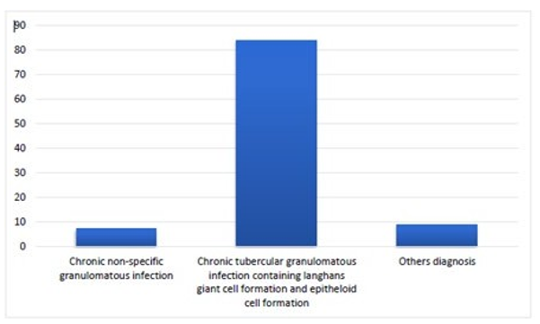Chronic tubercular granulomatous infection containing lang- hans giant cell formation and epitheloid cell formation histological finding was seen among 83.6% patients [Figure 4].