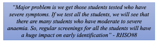 • Delay in Identification: Identification has been an issue in many schools majorly due to lack of regular screenings and skills in identification. All the stakeholders stated that they do ask the children to get their Hb tested before coming to the school from their nearest PHC. Some children get it done and some do not. Also, very few health supervisors know about the Rashtriya Bal Swasthya Karyakram (RBSK) program, where the RBSK team screens all the students in the school. This is done once or maximum twice a year. But many school staff including the principals are not aware of this scheme.