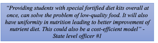 • Quality of Food: Quality of the food is not uniform and is varied in various districts and schools. Menu and the quantity of the food provided is more or less the same in the schools, but when it comes to quality it needs to be uniform and of high standard, which is currently a challenge.