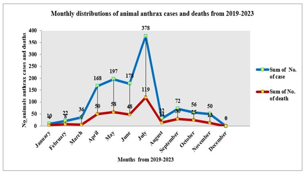 The highest cases of anthrax were registered in July (n = 378) followed by May (n = 197). There may be soil disturbance which results in ease of exposure of animals to the spores of bacillus anthracis leading to high numbers of cases or probably to outbreaks.